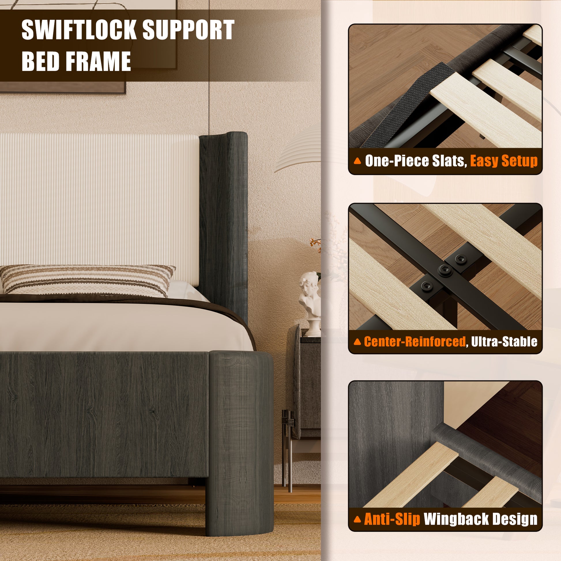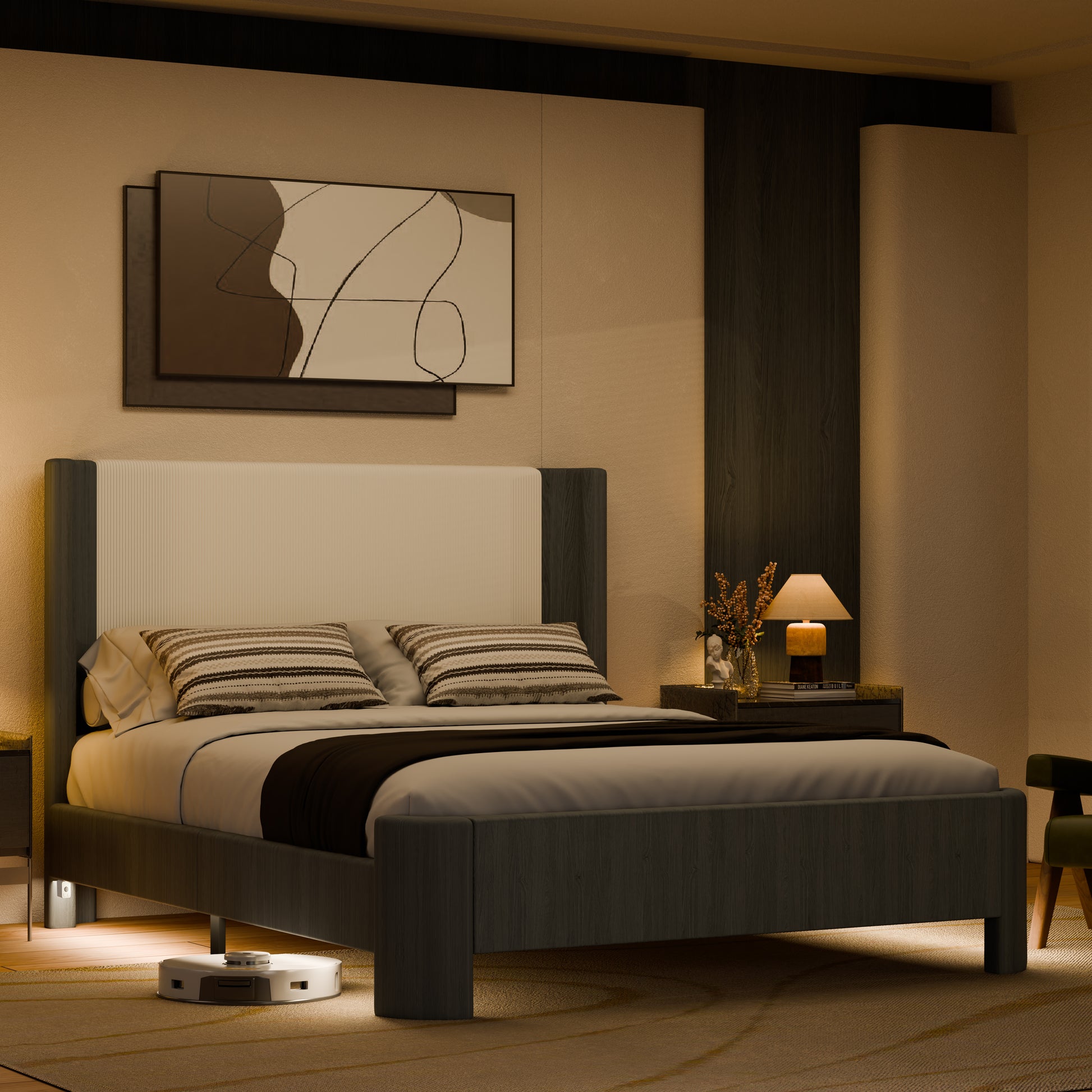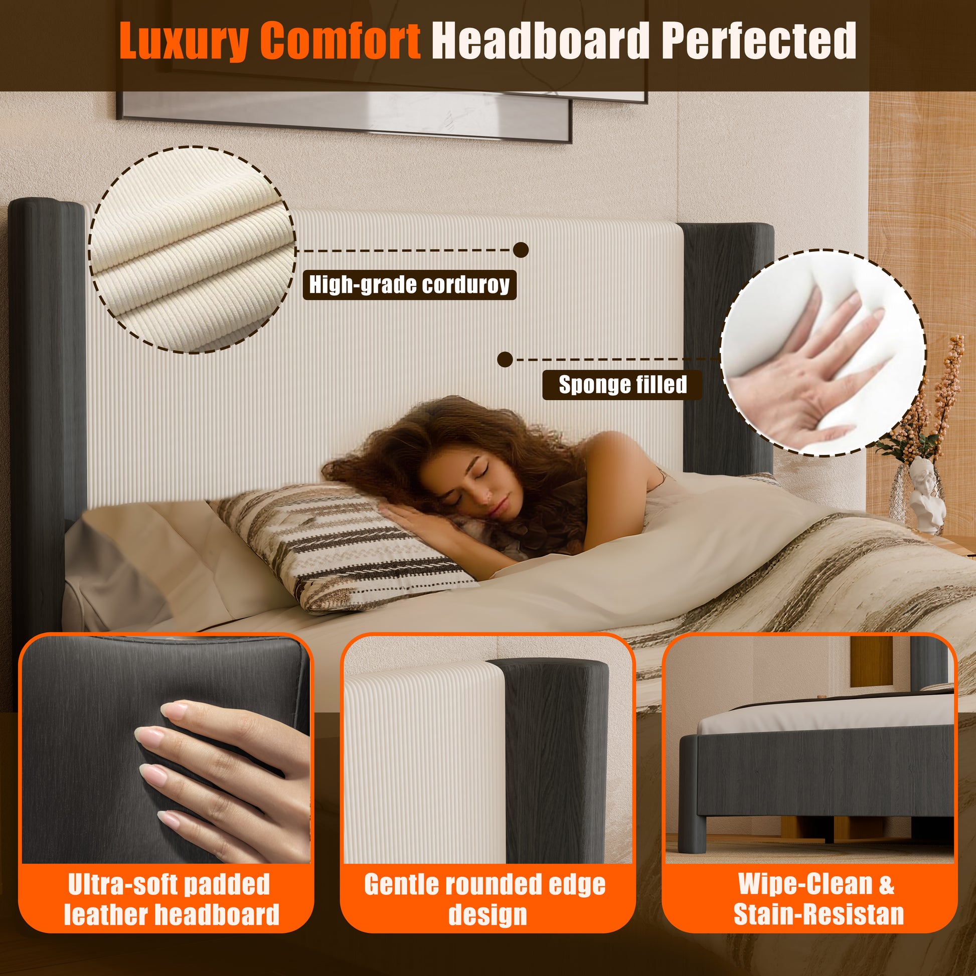 - Plush Fabric Upholstery with Protective Rounded Design: Crafted with natural oak textured faux leather fabric covering the headboard and footboard, it creates a warm and inviting bedroom atmosphere. The contemporary wingback silhouette, combined with smooth, rounded corners enhances your room's aesthetics while providing added assurance for households with children or pets.