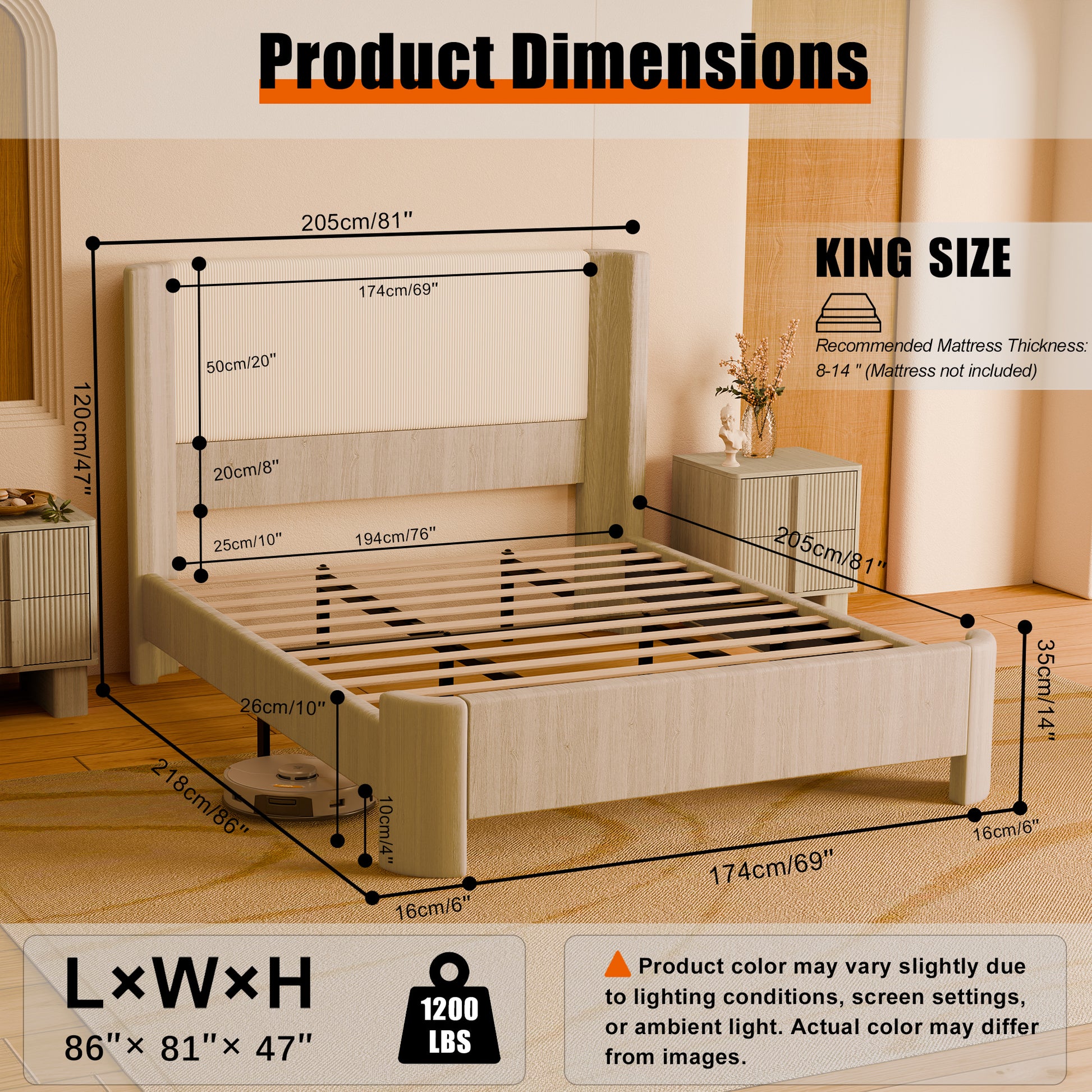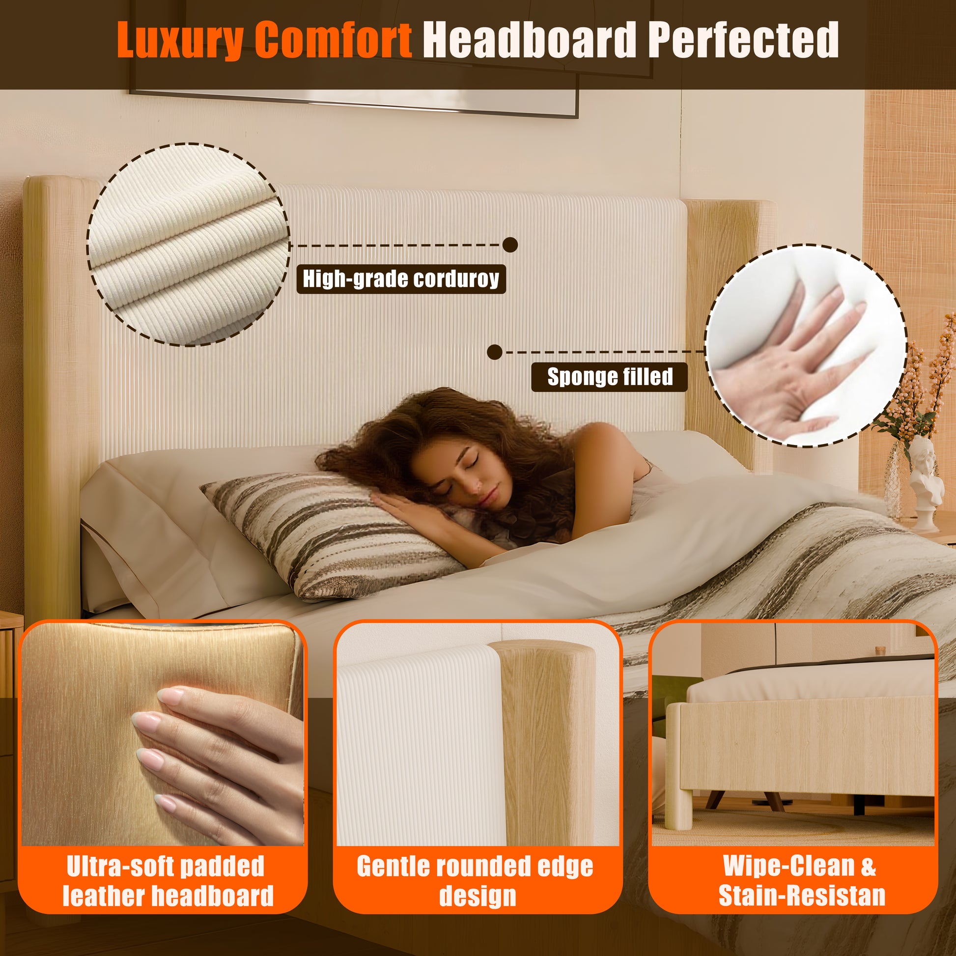 - Plush Fabric Upholstery with Protective Rounded Design: Crafted with natural oak textured faux leather fabric covering the headboard and footboard, it creates a warm and inviting bedroom atmosphere. The contemporary wingback silhouette, combined with smooth, rounded corners enhances your room's aesthetics while providing added assurance for households with children or pets.