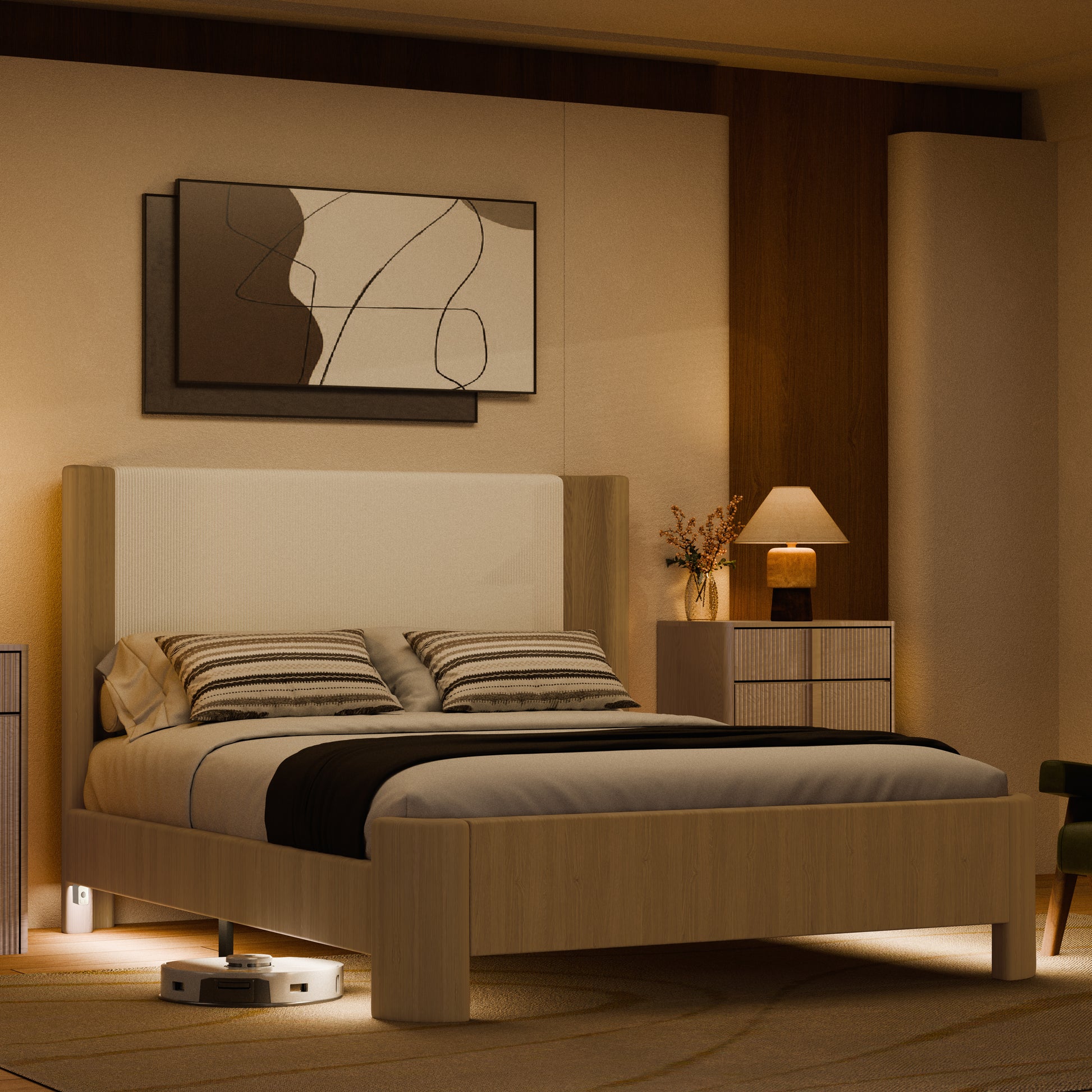 Upholstered Bed Frame with Underbed Motion Sensor Night Light, Light Oak